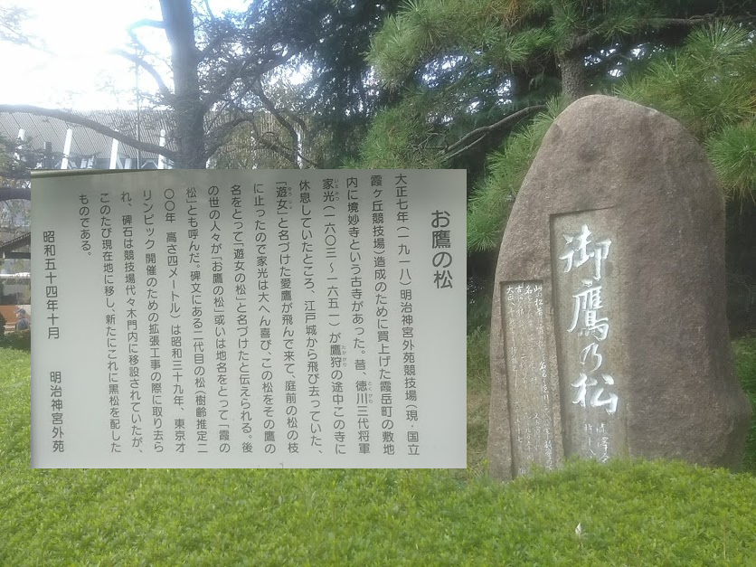 大正7年(1918)明治神宮外苑競技場(現国立霞ヶ丘競技場)造成のために買上げた霞岳町の敷地内に境妙寺という古寺があった。昔、徳川3代将軍家光(1603~1651)が鷹狩の途中この寺に休息していたところ、江戸城から飛び去っていた、「遊女」と名づけた愛鷹が飛んで来て、庭前の松の枝に止まったので家光は大へん喜び、この松をその鷹の名をとって「遊女の松」と名づけたと伝えられる。後の世の人々が「お鷹の松」或いは地名をとって「霞の松」とも呼んだ。碑文にある2代目の松(樹齢推定200年 高さ4メートル)は昭和39年(1964)、東京オリンピック開催のための拡張工事の際に取り去られ、碑石は競技場代々木門内に移設されていたが、このたび現在地に移し、新たにこれに黒松を配したものである。