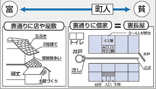 表長屋(1階が商い、2階が住居で裕福な人が住む)と裏長屋(一般庶民が住む):